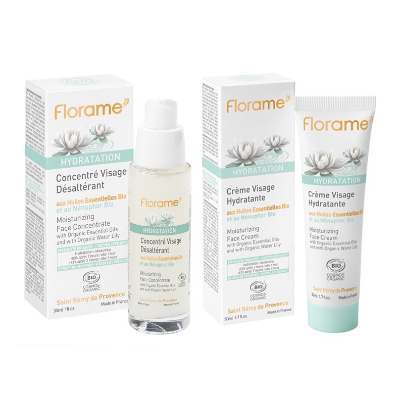 The HYDRATATION range combines the essential care products for fresh, radiating beauty skin. Resulting from Florame research, these expert formulas are adapted to different skin types and are a true source of intense and immediate hydration. The Organic Water Lily extract and the duo of medium and high molecular weight hyaluronic acids combine their virtues for visible efficacy, from the very first application. Thanks to the alliance of an exclusive complex of Organic Essential Oil* with floral and plant notes, the face is revitalized and protected from environmental damage.